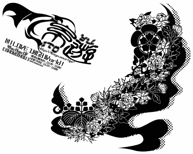 花だけは横着して買ったデータを使ったんですが、他は色々作ってみました。ロゴもフォントじゃなくてちゃんと作ってたんですけど、絵面と合わなかったかんで潔く没に。ううーん、相変わらず微妙な(汗)
