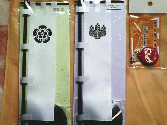 本当は以前買った信秀の家紋のストラップを使う用にもう一個づつ買ってこようと思ったんですが、のぼり買うから止めました。清正のストラップも欲しかったのになかったよ…ちくしょう(血涙)