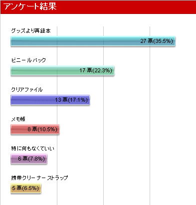 OK。グッズはまぁ、今回夏コミ落選したつーのもあるんで出しませんが、再録本が一番ご希望多かったということで、来年の夏コミ目指して再録本など出したいと思います。まだ再録する程本出してないんですよね…ははは(吐血)