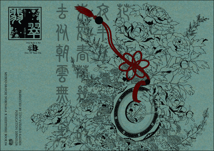 花は牡丹、花の中に埋まってる輪っかは円環(他に色々名称はあるようですが)というやつで、昔の中国の方が帯止めかなんかに使っていたものです。結構、翡翠が使われたいたらしい。んでもって、男女の契りを交わす時の円環と花を交換して云々という話をどこかで聞いたことがあったので(笑)ここまで書いてしまうと、ほぼネタバレみたいなもんですけども(笑)背景の漢詩も恋の詩だったりします。